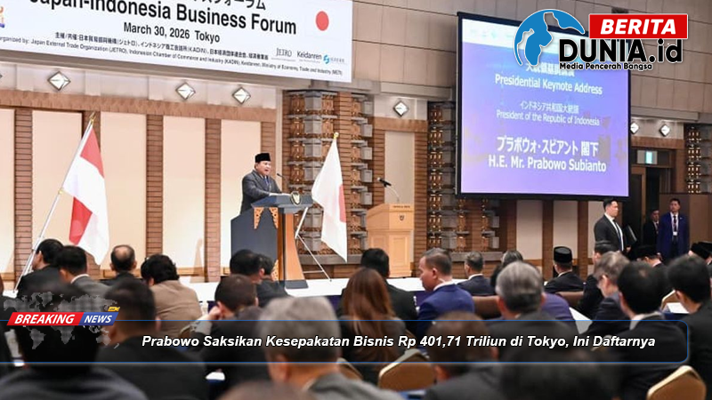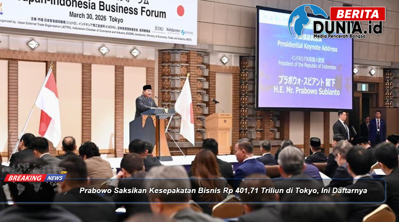 Beritadunia.id โ Presiden Republik Indonesia, Prabowo Subianto, menyaksikan langsung penandatanganan sejumlah kesepakatan bisnis antara Indonesia dan Jepang dengan total nilai mencapai Rp 401,71 triliun. Momen tersebut berlangsung dalam forum bisnis IndonesiaโJepang di Tokyo dan menjadi salah satu capaian penting dalam diplomasi ekonomi Indonesia.
